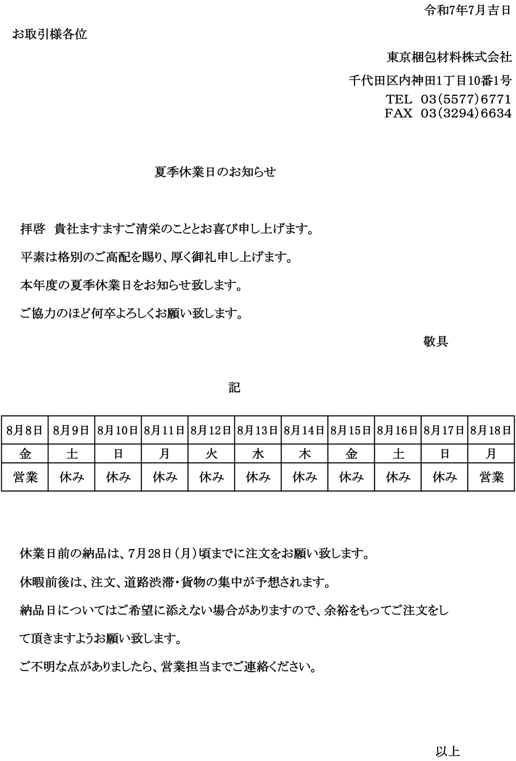 夏季休暇のお知らせ